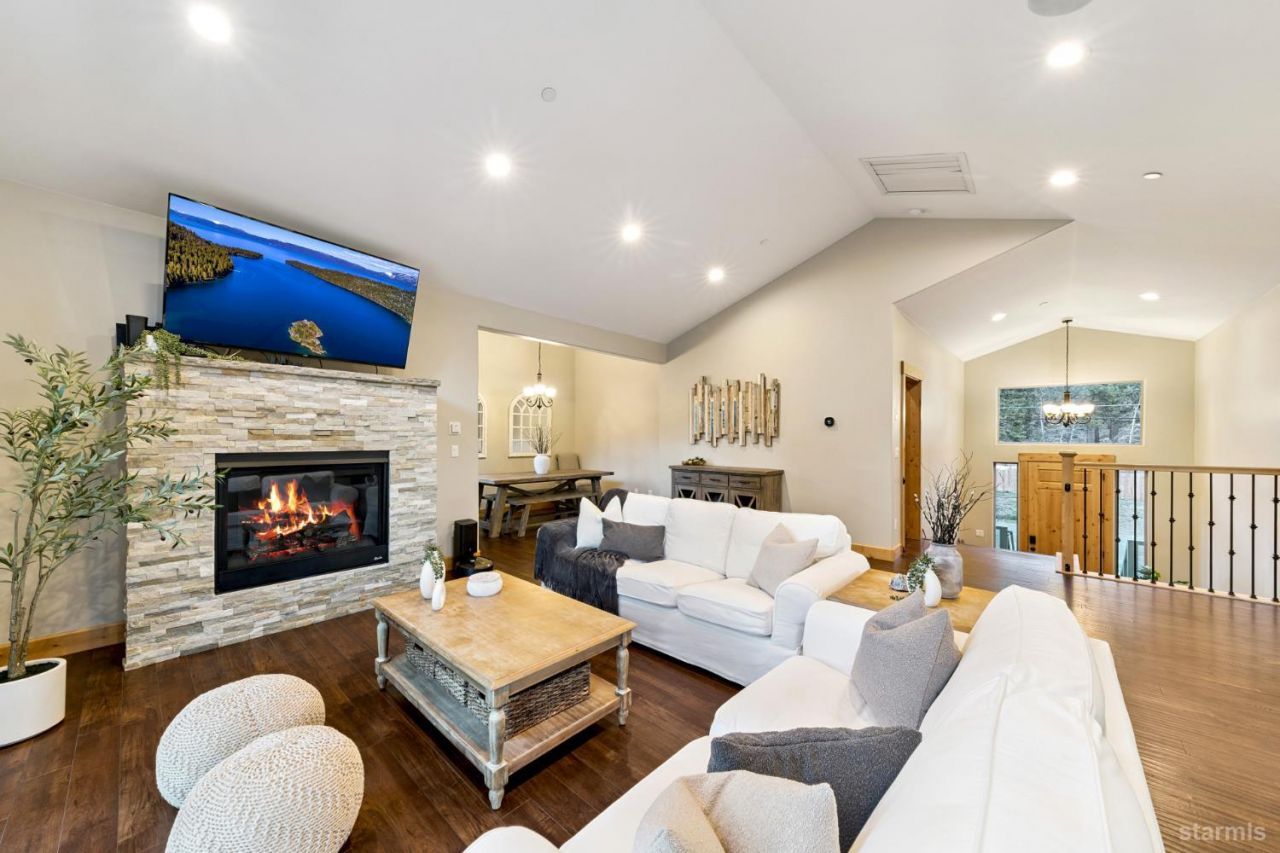 Quality custom Christmas Valley home on a sunny and level lot with filtered mountain views. This spacious 4-bedroom, 3-bathroom residence offers 2,792 square feet of thoughtfully designed living space on a 10,018 square foot lot and features expansive front and rear decks that provide excellent outdoor living and a peaceful mountain setting.The main living area features a large great room with vaulted ceilings, quality laminate flooring, surround sound, and a gas fireplace with a beautiful ledgestone surround. The kitchen is designed for both everyday living and entertaining, offering granite slab countertops, custom knotty alder cabinetry, stainless steel Thermador appliances, and a large island with a prep sink and additional workspace.The upstairs primary suite provides a comfortable retreat and features a see-through gas fireplace that connects to the spa-style bathroom with a jetted soaking tub, stall shower, dual sink vanity, and a generous walk-in closet.The main level also includes a guest bedroom and full bathroom, offering flexibility for guests or a home office.Downstairs is a spacious family or game room with a third gas fireplace, wet bar, and French doors leading to the fully fenced backyard. Two additional guest bedrooms and a full bathroom complete the lower level, creating a functional layout for family and guests.Additional highlights include an oversized two-car garage, quality finishes throughout, and multiple outdoor living areas to enjoy the mountain setting.Located in the desirable Christmas Valley neighborhood, the home is close to miles of hiking and biking trails leading to the Truckee River and is conveniently situated between Sierra-at-Tahoe, Kirkwood, and Heavenly ski resorts, while only a short drive to the beaches of Lake Tahoe.